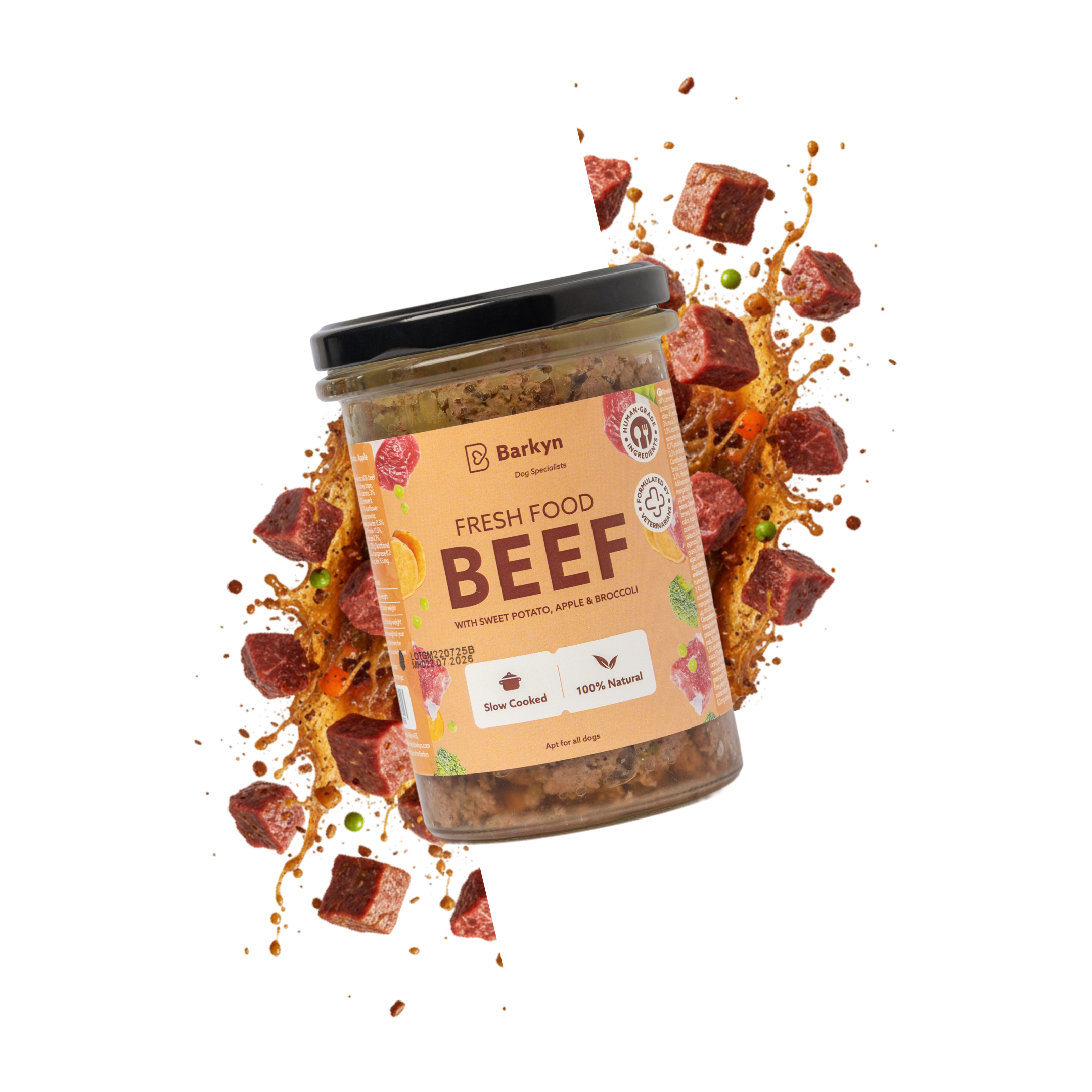 Composição e ingredientes: 60% carne magra de bovino, 10% miudezas de bovino (coração, rim, tripa, fígado), 5% batata- -doce, 4% ervilhas, 4% cenouras, 3% brócolos, 3% maçã, 2% courgette, 2% levedura de cerveja, 1,8% espinafres, 1,5% óleo de algas, 1% sementes de girassol, 1% sementes de abóbora, 0,7% pó de algas, 0,4% pó de rosa-mosqueta, 0,3% pó de algas marinhas, 0,3% alecrim. Constituintes analíticos: Proteína 17,5%, gordura bruta 7,5%, humidade 66%, matéria mineral 2,3%, fibra bruta 1,4%. Energia: 150 kcal / 100 g. Aditivos nutricionais por 100 g: Vitamina D 35 UI, manganês 0,2 mg, cobre 0,2 mg, selénio 12,5 µg, zinco 3,5 mg.